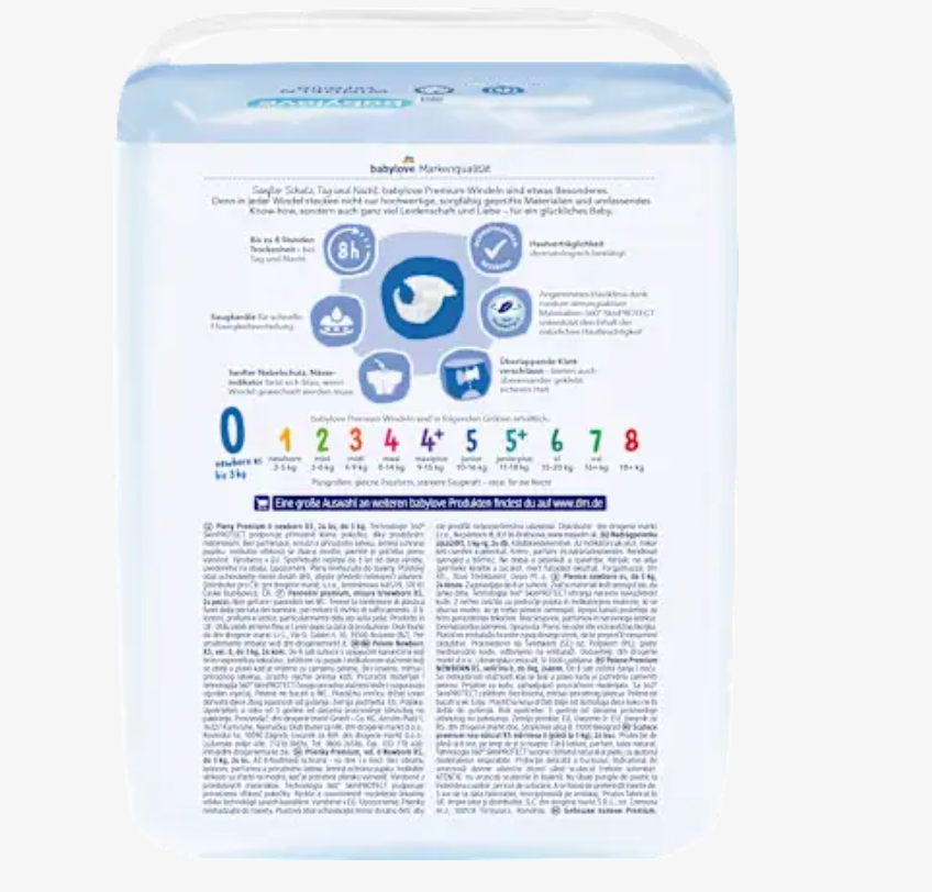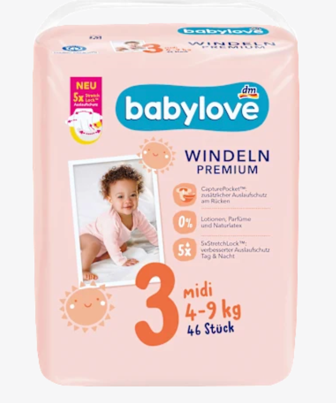 Poznaj Pieluchy babylove Premium Midi w rozmiarze 3, dla dzieci o masie od 4 do 9 kg, które cechują się idealnym dopasowaniem umożliwiającym luźne, nieskrępowane ruchy Twojego maluszka. Obecność w pieluszkach nowoczesnego systemu 360° SkinProtect pomaga zachować naturalną wilgotność skóry, co jest niezbędne dla zdrowia i komfortu dziecka. Produkt wykonany jest z przepuszczalnych materiałów gwarantując optymalny klimat dla delikatnej skóry, a odpowiednio zaprojektowane kanały chłonne równomiernie rozprowadzają wilgoć, oferując nawet do 12 godzin suchości. Miękki StretchLock, w jaki wyposażone są mankiety nogawek, znacząco zwiększa komfort noszenia i skutecznie zapobiega przeciekaniu. Ponadto, pieluchy babylove są przyjazne dla środowiska – folia zawiera co najmniej 80% materiałów z recyklingu, a produkt w swoim składzie nie zawiera balsamów, perfum ani naturalnego lateksu. Postaw na Pieluchy Premium Midi od marki babylove i ciesz się spokojem oraz wygodą dla swojej pociechy!