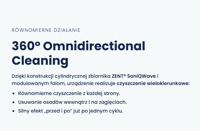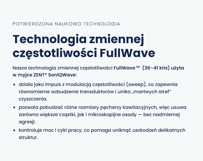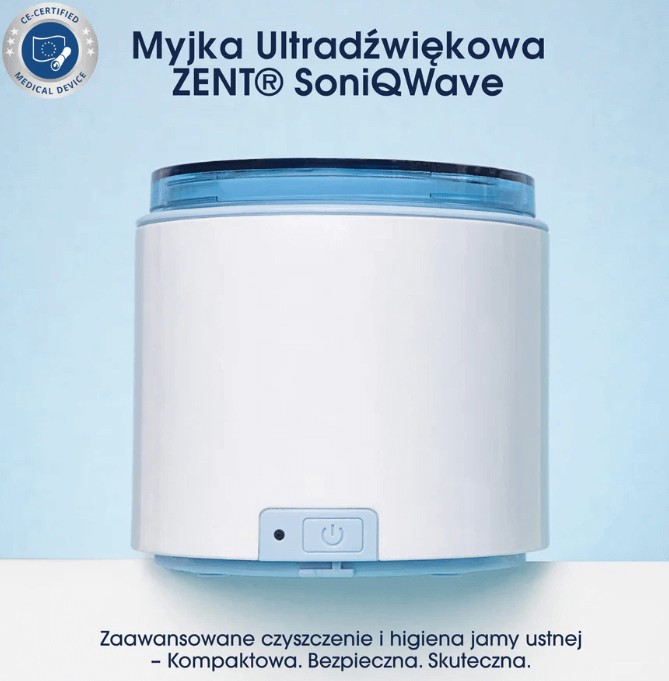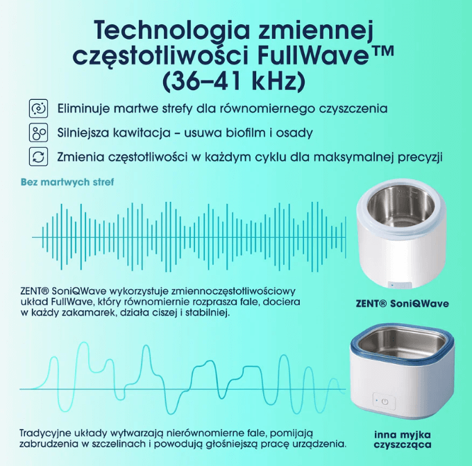 ZENT® SoniQWave to profesjonalna myjka ultradźwiękowa oparta na technologii zmiennej częstotliwości FullWave™, oferująca skuteczność porównywalną z gabinetem stomatologicznym — teraz dostępna w domowym użytku.